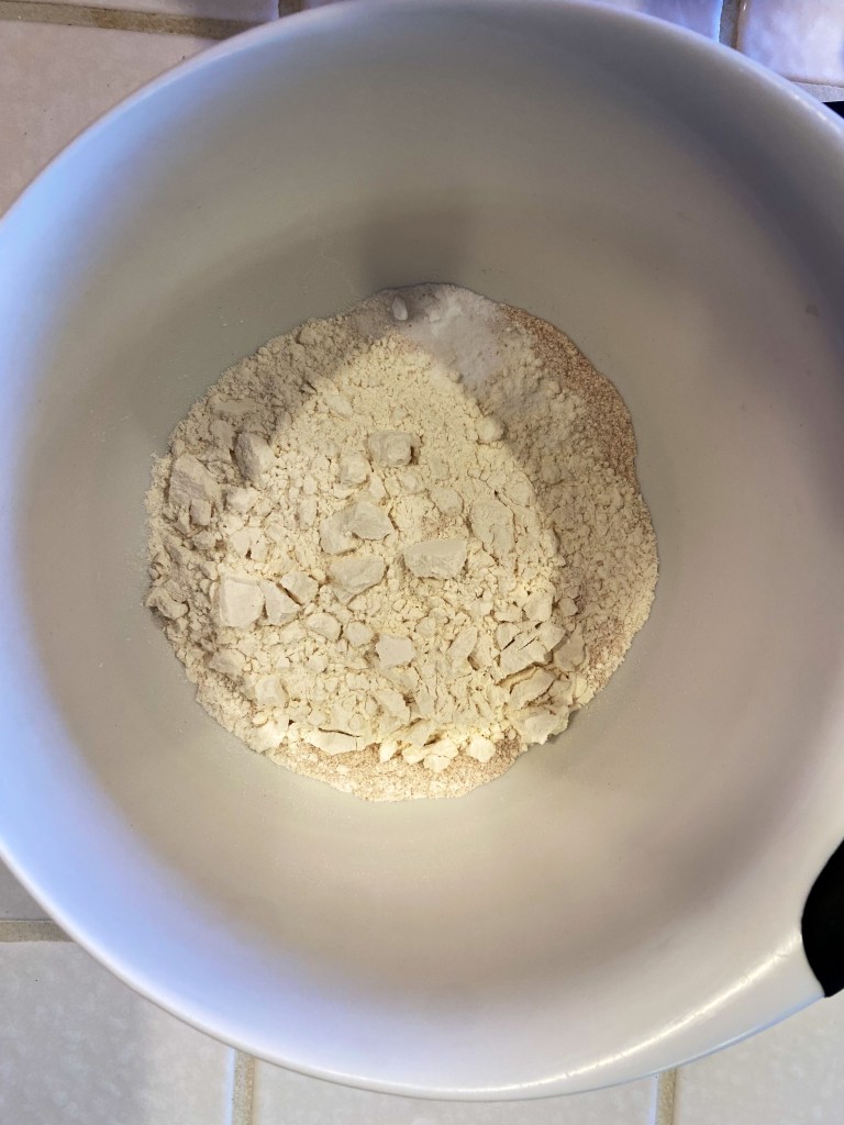 First, you’re going to whisk together your dry ingredients, which are spelt flour, white flour, baking soda and salt!