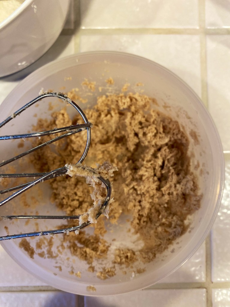 Then, beat together the wet ingredients until combined and fluffy! You don’t want any chunks of butter or pockets of brown sugar, don’t worry about over beating! Then, you can add in your dry ingredients into the mix and use the beaters to combine until a dough forms! Don’t forget to scrape the sides of the bowl if needed.