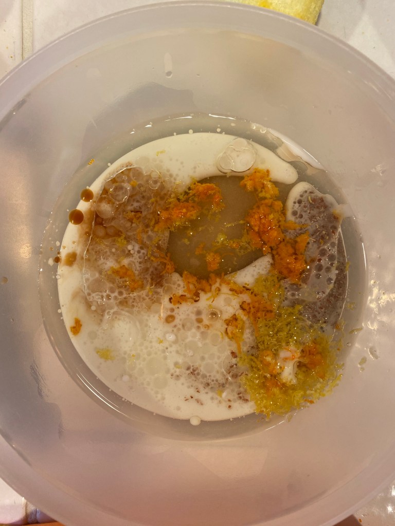 Next, in a small bowl, whisk together the sugar, coconut milk, vegetable oil, flax eggs, vanilla, and the lemon and orange zest! Use any non dairy milk you’d like, including oat milk, almond milk, or soy milk!