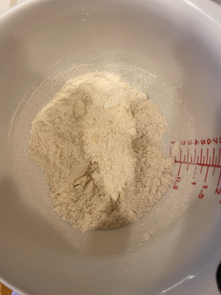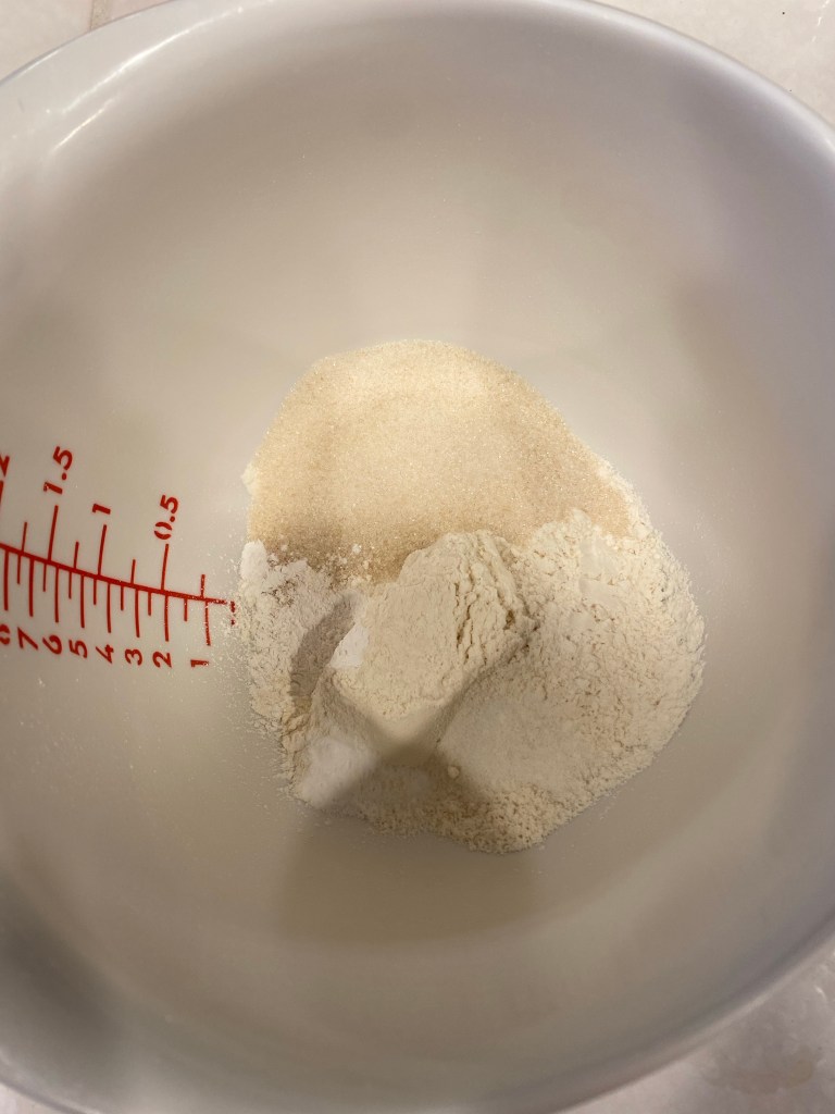 1. Preheat oven to 350F. In a medium bowl, combine the dry ingredients and the sugar together. Add in the softened butter and use a spoon to completely combine until only small chunks or crumbles remain.