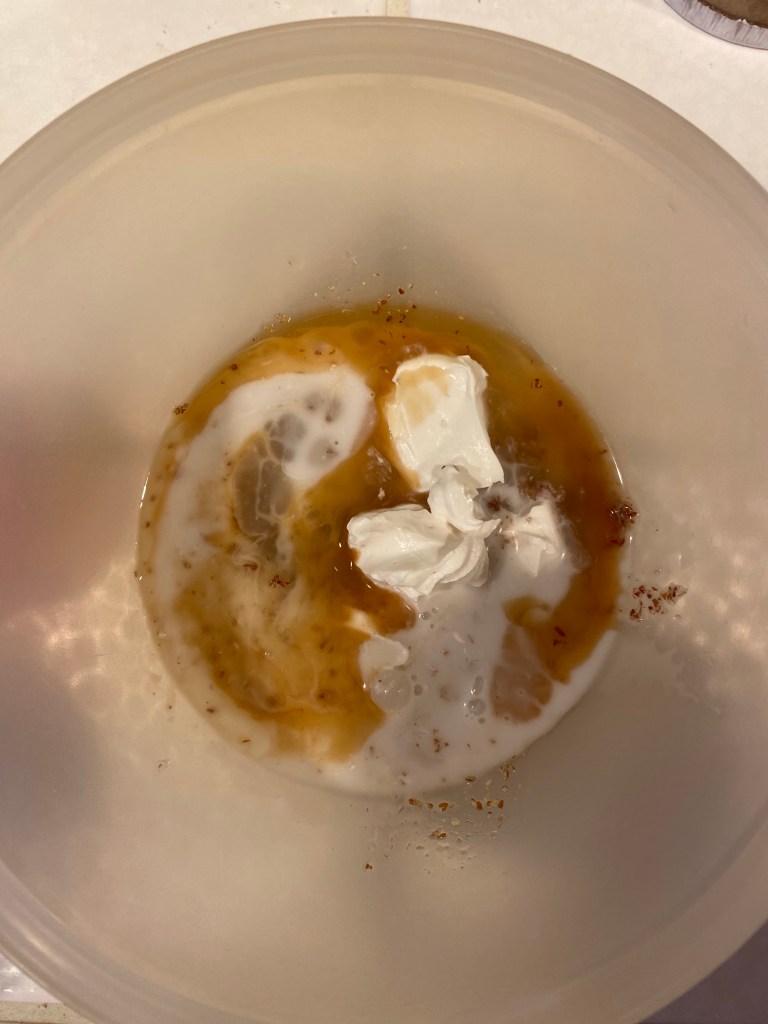 In a separate bowl, combine the flax egg, vegan sour cream, vanilla extract and coconut milk. The vegan sour cream can be replaced with a dairy free yogurt! The coconut milk can also be replaced with any dairy free milk, such as soy milk, oat milk, or almond milk!