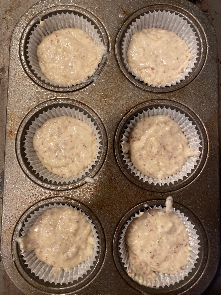 Once the wet ingredients are whisked together, pour them into the flour mixture and fold together. Make sure not to over-mix. Scoop into greased muffin liners and let rest for five minutes.