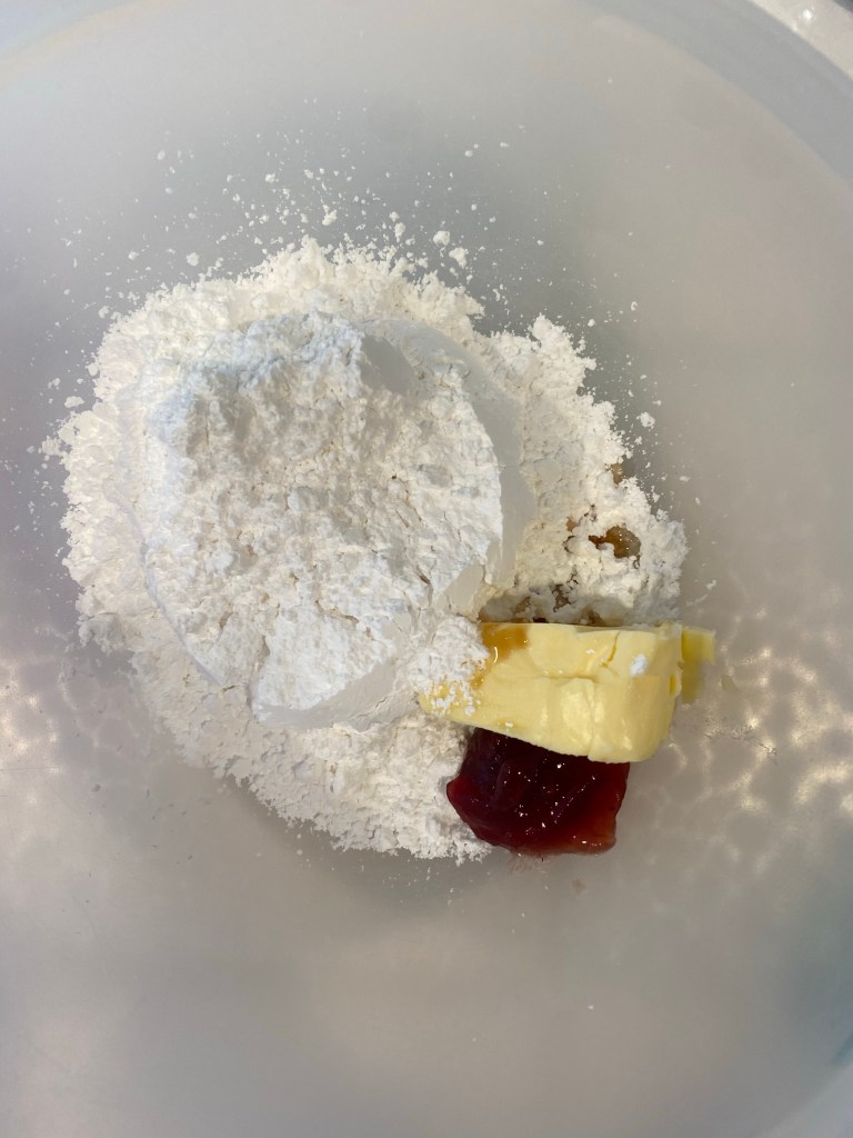 3. Make the frosting once the cupcakes are cooled. Start by combining the vegetable shortening, powdered sugar, vanilla, and jam. Mix until combined, then add in the coconut milk.