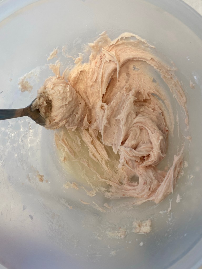 After mixing all four ingredients with a spoon until completely combined, it will result in a very stiff or even crumbly result. That’s when you add in the coconut milk, using a spoon to combine. You are welcome to add more if you want a softer frosting, but be careful not to add too much or else your buttercream may be to runny to frost your cupcakes with.