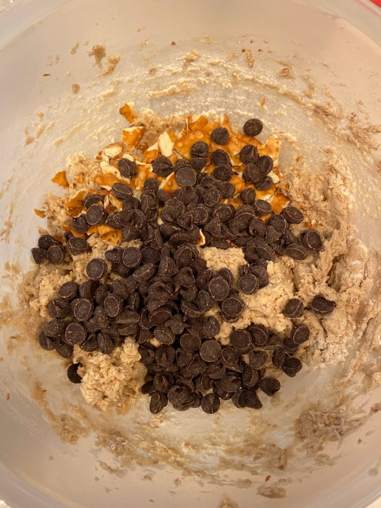 Last, but certainly not least, we have to fold in the chocolate chips and crushed pretzel chips! Use any kind of chocolate chips you would like here, I used 72% dark chocolate but if you prefer semisweet, go for it! The pretzel chips can be replaced with hard pretzels if you can’t find pretzel chips where you live!