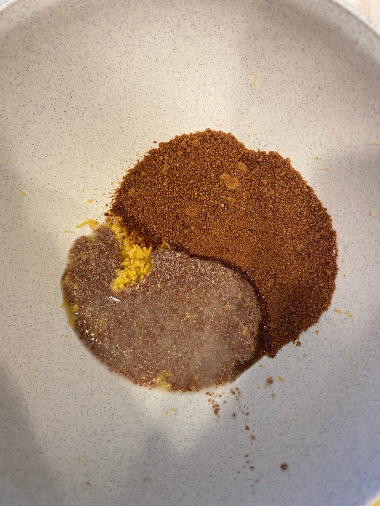 1. Preheat oven to 350F. Grease and line an 8×8 baking pan. Combine the lemon zest, coconut sugar and flax eggs. Whisk until combined.