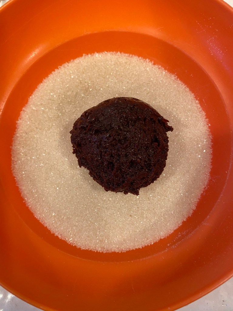 2. In a separate bowl, whisk together the cocoa powder, flour, baking soda, and salt. Add into the wet ingredients and beat together. Using your hands or a cookie scoop, shape cookies into balls and roll them in the sugar.
