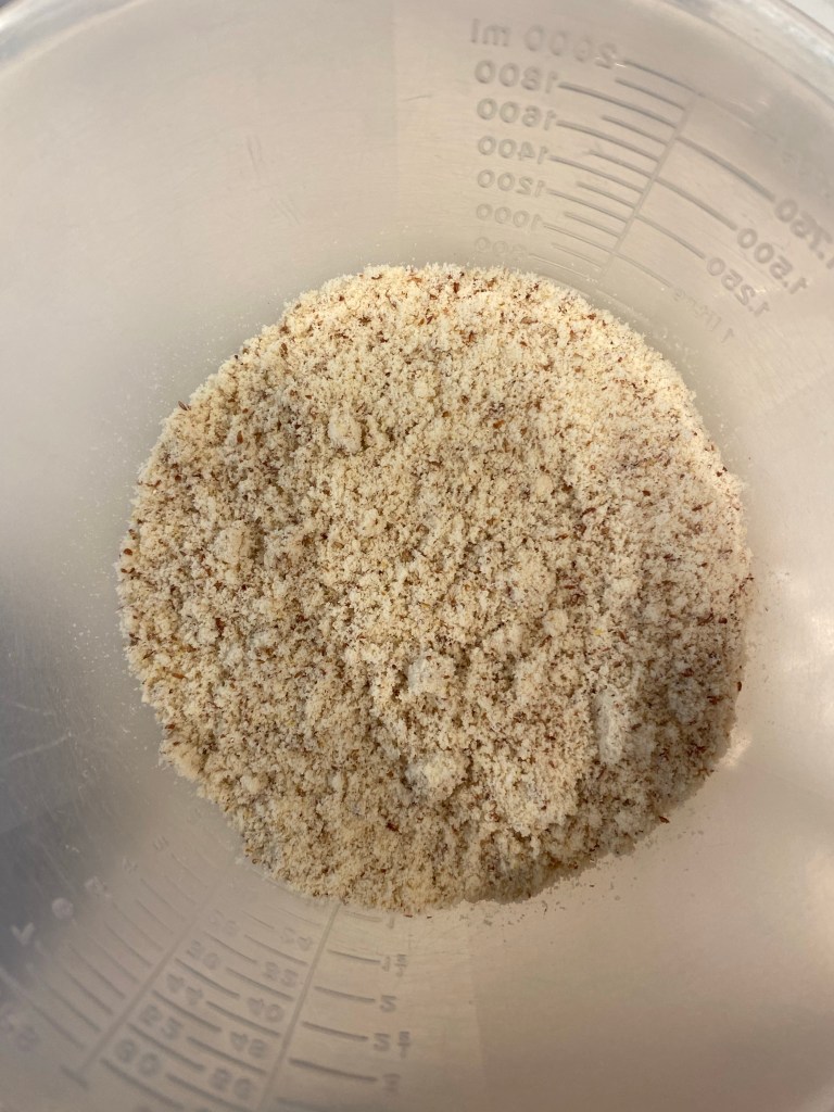 Next, whisk together the almond flour, ground flaxseed, baking powder and salt. The almond flour gives the cookies their signature soft texture, and the ground flax seed helps hold the cookies together, similar to if we were using flax eggs.