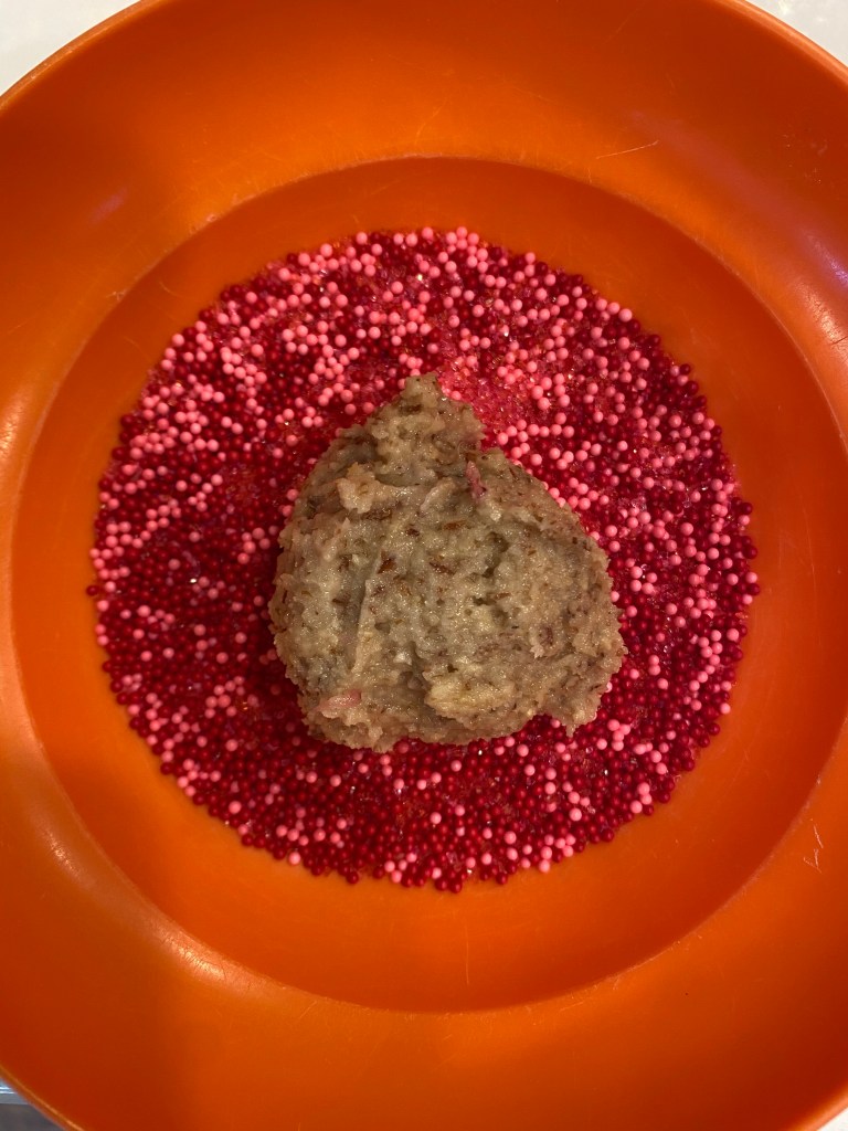 3. In a separate larger bowl, whisk together the cashew butter, maple syrup, vanilla extract and dairy free yogurt. Then whisk in the mashed strawberries. Add in the dry ingredients into the wet and fold together until combined. Using your hands or a cookie scoop, carefully place in a shallow bowl filled with sprinkles.
