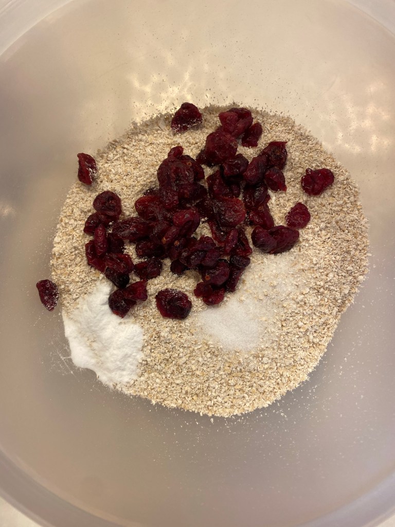 1. Preheat oven to 350F. Line a baking sheet with parchment or a silicone mat. In a bowl, mix together the oat flour, salt, baking soda, and dried cranberries.