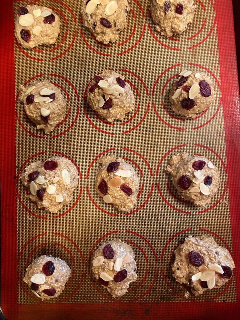 3. Scoop onto a the baking sheet, then sprinkle with more dried cranberries and sliced almonds. Bake for 15-18 minutes, cool, and enjoy!