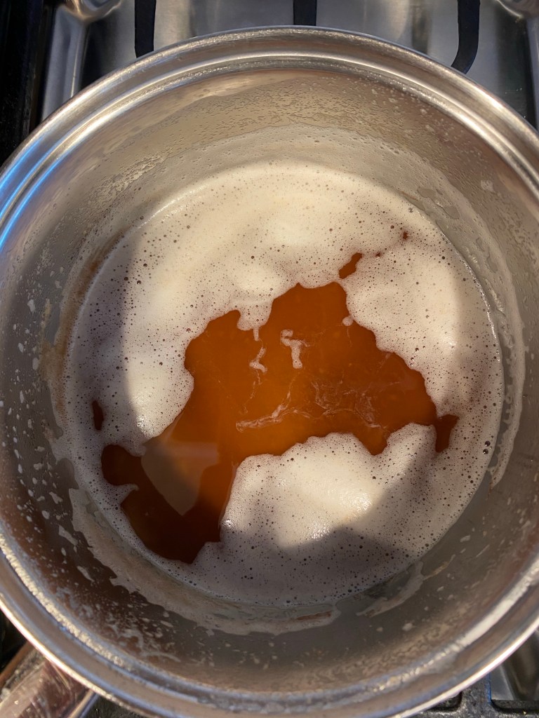 First, preheat the oven to 325F and line a pan with parchment or a silicone baking mat. In a saucepan over medium heat, begin melting the vegan butter. You want to keep cooking the butter until brown specks begin to form at the bottom and it turns a dark amber color.