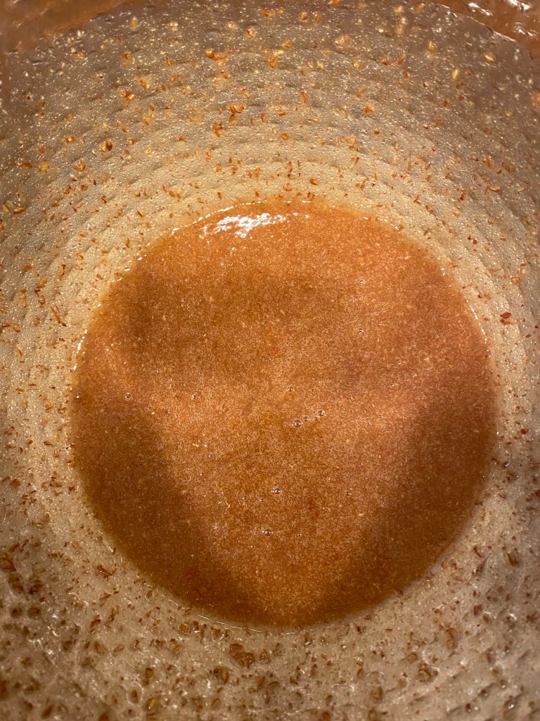 2. Pour into a heat safe bowl and cool for a few minutes. Whisk in the sugar, and then mix in the flax eggs and vanilla.