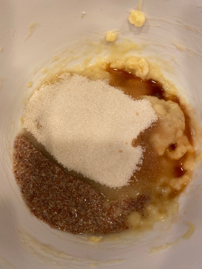 In a separate large bowl, whisk together the mashed bananas, flax egg, sugar and vanilla extract. Add in the melted coconut oil! If you don’t have or like the taste of coconut oil, you can use melted butter or any other liquid oil, such as vegetable, avocado, or canola oil!