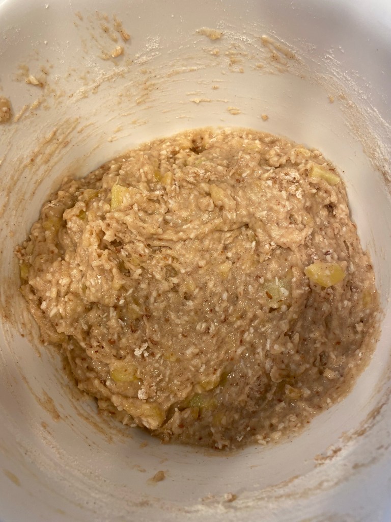 2. In a larger separate bowl, whisk together the mashed bananas, vanilla, sugar, and flax egg. Then stir in the melted coconut oil. Fold in the chopped pineapple and shredded coconut.
