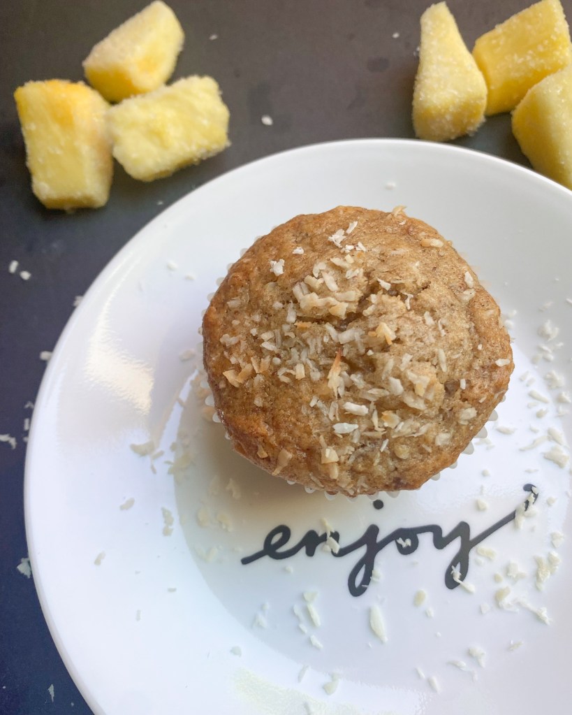 Then fold in the chopped pineapple and shredded coconut. I used chopped frozen pineapple, but you can chop fresh or canned pineapple as well! Add the dry ingredients into the wet ingredients, fold together, and divide into the muffin tins. Sprinkle with more coconut, and bake for 20-22 minutes. Cool, and enjoy!