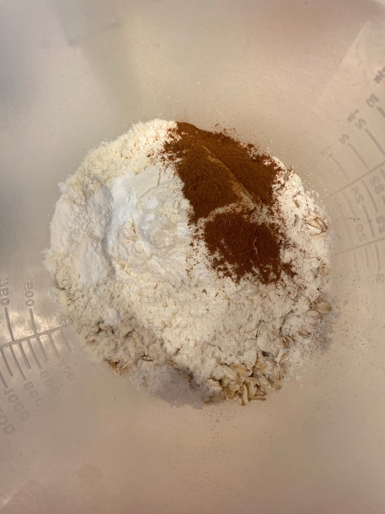 1. Preheat your oven to 350F and line a baking sheet with a silicone mat or parchment paper. In a medium bowl, whisk together the oat flour, flour, oats, baking soda, cinnamon, and kosher salt.