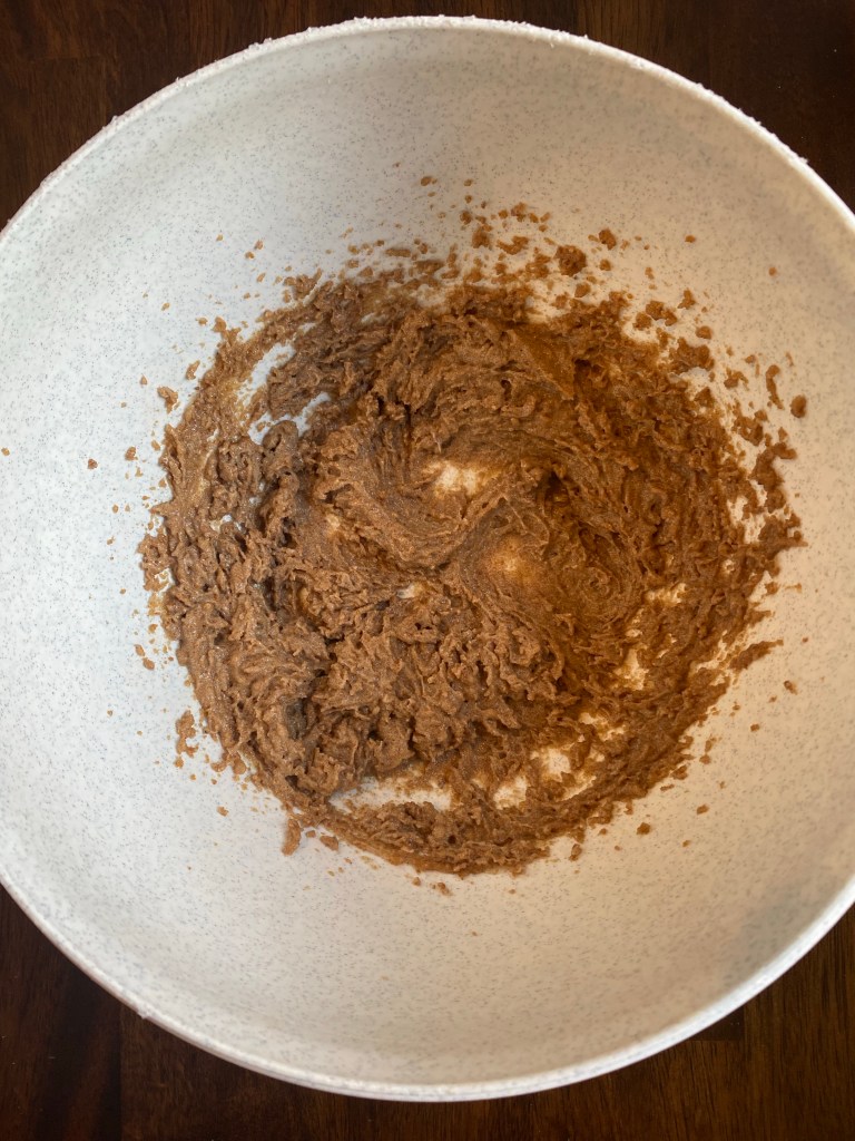 1. Preheat oven to 350F and spray an 8×8 pan. In a medium bowl, beat together the coconut oil and coconut sugar. Then beat in the flax egg and vanilla extract.