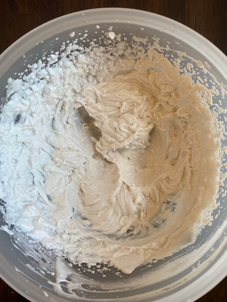 Then, using a hand mixer or a stand mixer, whip the dairy free heavy cream until soft peaks start to form. You could also use canned coconut cream here if you wish, but there will be more of a coconut flavor!