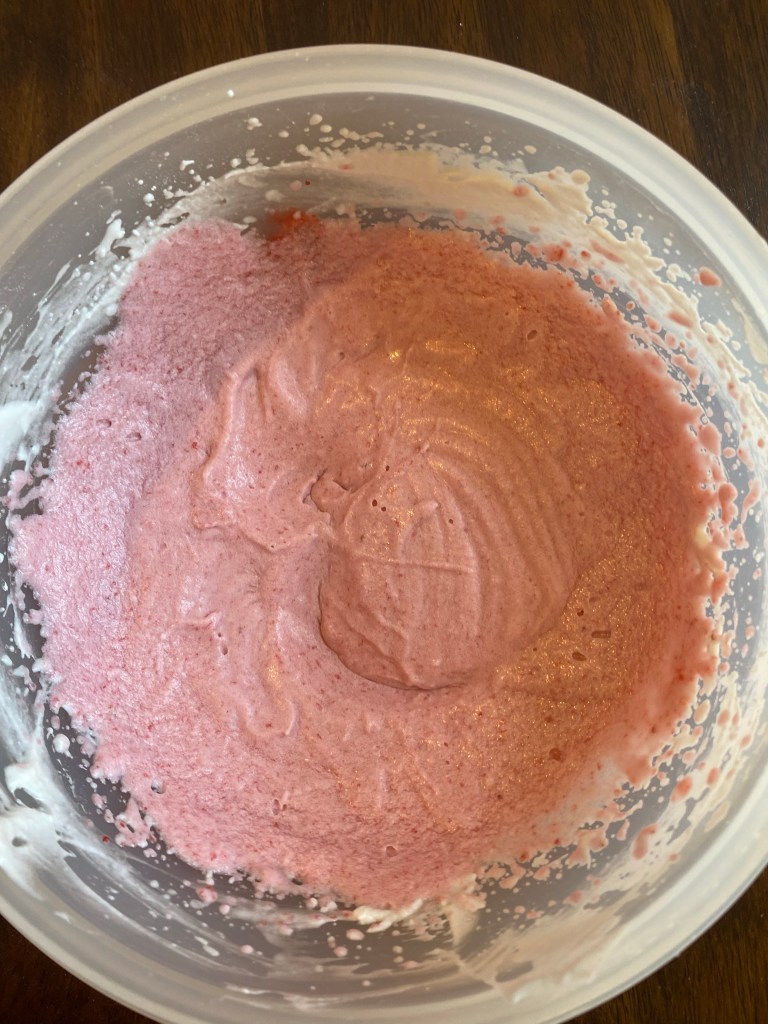 Once soft peaks form, add in the powdered sugar and sieve in the strawberry purée. Make sure to strain it before adding it in, unless you want seeds and chunks in your ice cream topping.