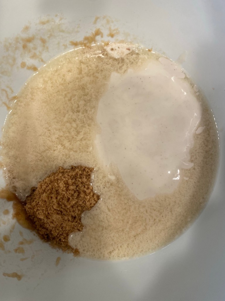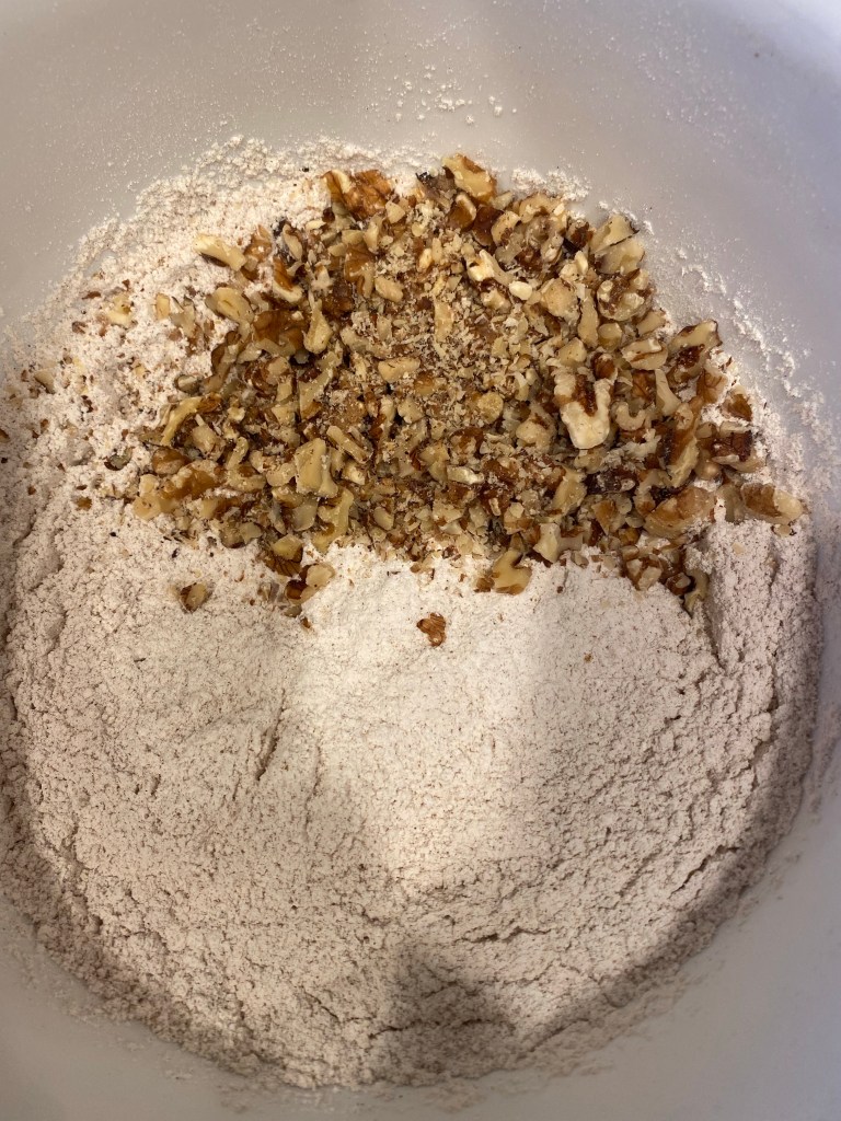 2. Stir in the chopped nuts and set aside. In a large bowl, whisk together the brown sugar, mashed bananas, melted vegan butter, dairy free yogurt, apple cider vinegar and flax eggs.