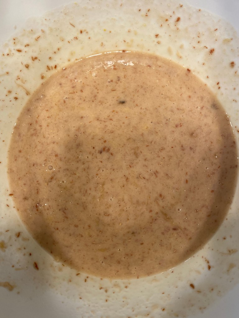 Make sure they’re chopped small enough so you don’t get any whole nut chunks in your muffins, but not too small you don’t lost that amazing texture and crunch! In a separate bowl, whisk together the brown sugar, melted vegan butter, mashed bananas, dairy free yogurt, apple cider vinegar, and flax eggs!