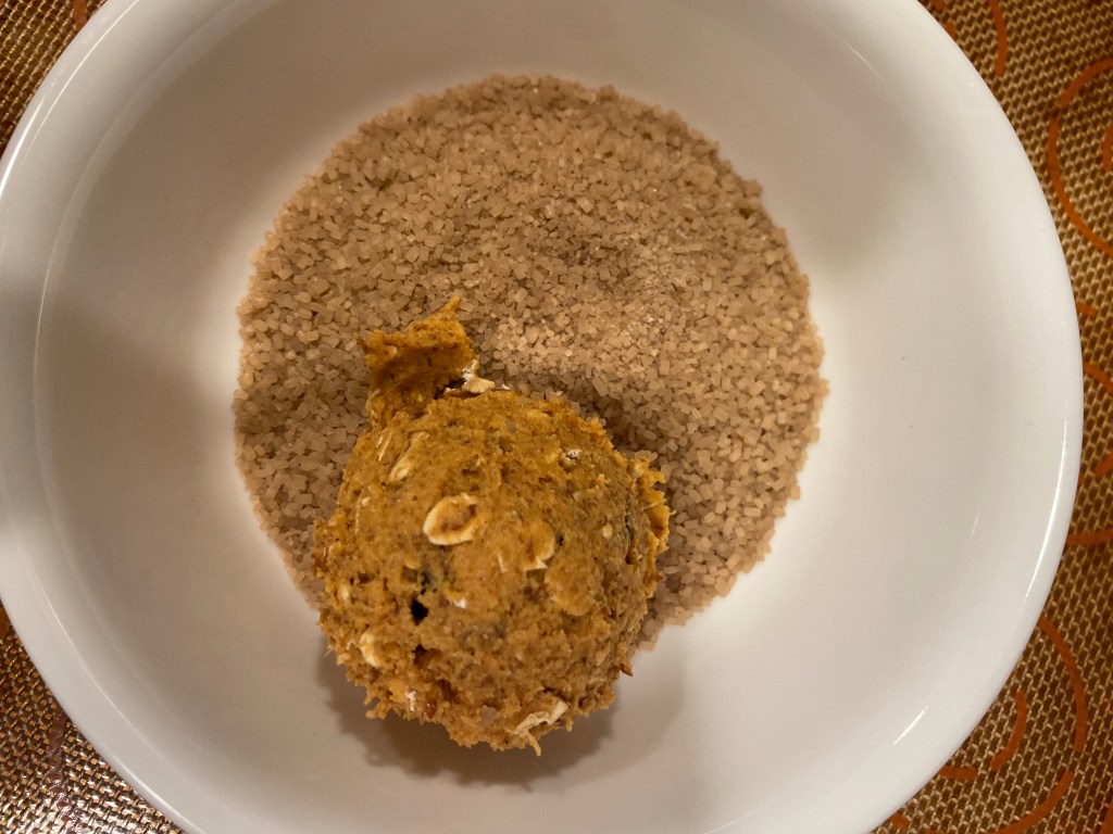 Carefully place in a shallow bowl with your Demerara, Turbinado, or even plain white sugar! I love using sugar varieties with larger granules so you get that nice crunch, but it’s up to you. Roll the dough balls in the sugar, and then place on the prepared baking sheet. Bake for 17 minutes, cool and enjoy!