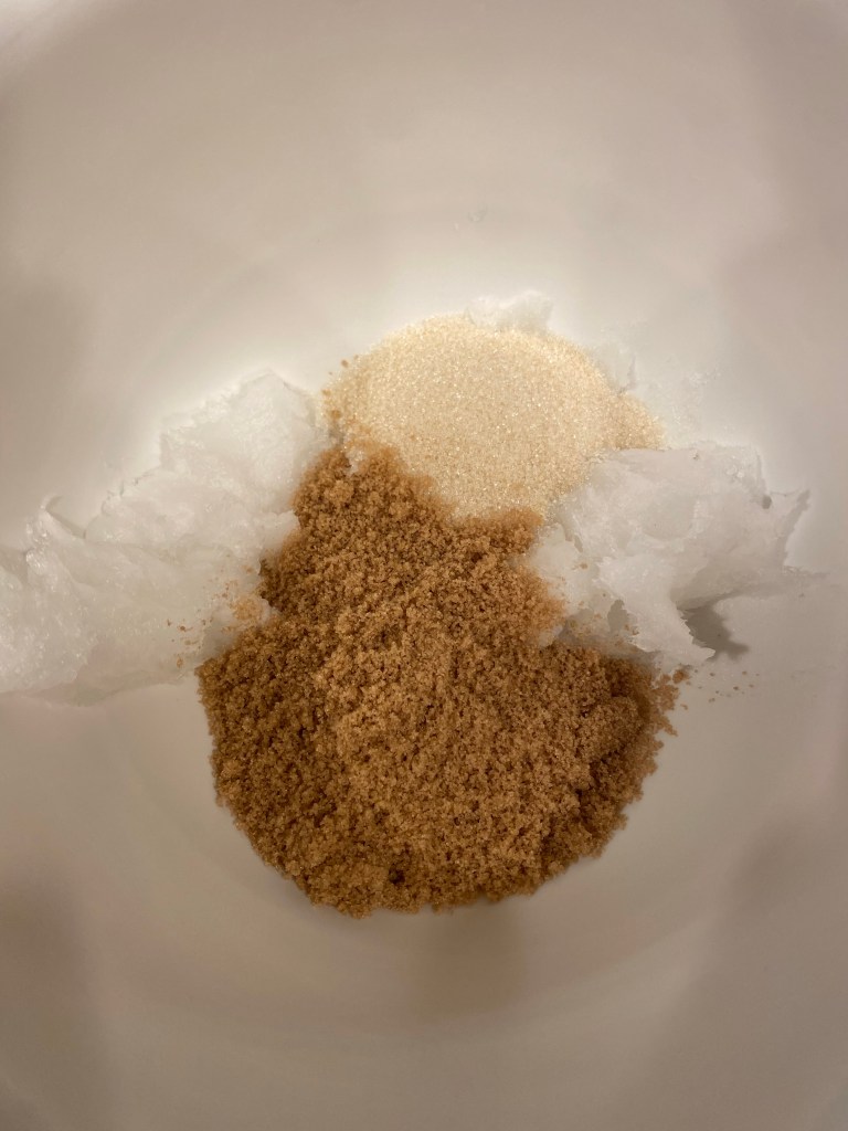 First, preheat the oven to 350F and line two baking sheets with parchment or silicone mats! This recipe makes 24 cookies! Beat together the coconut oil, white sugar, and brown sugar!