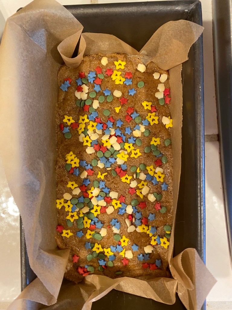 2. Add in the almond flour, baking powder, and salt. Mix until a dough forms. Press into the lined loaf pan. Press sprinkles of choice on top of the dough and bake for 15 minutes. Cool in the pan, slice, and enjoy!