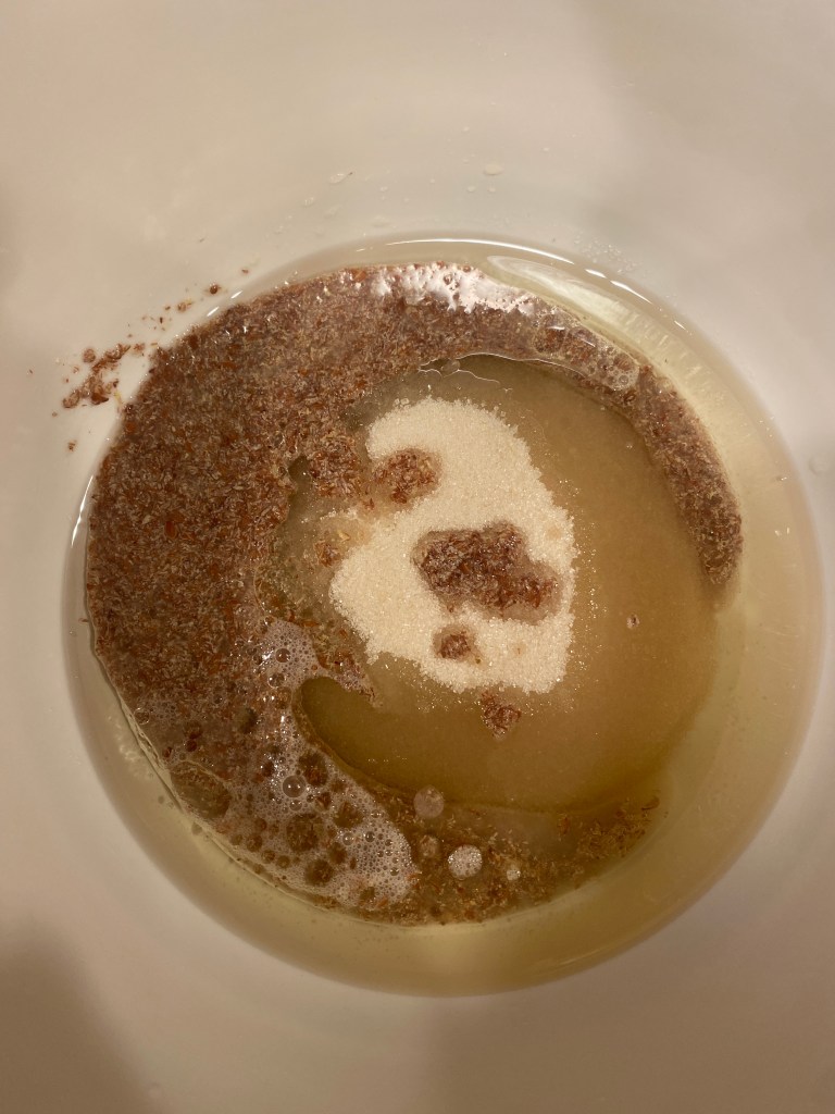 In a medium bowl, whisk together the vegetable oil, sugar, and flax eggs! Vegetable oil helps keep these donuts moist and delicious, you can use any other neutral oil or even melted coconut oil or vegan butter! Flax eggs help bind our batter together!