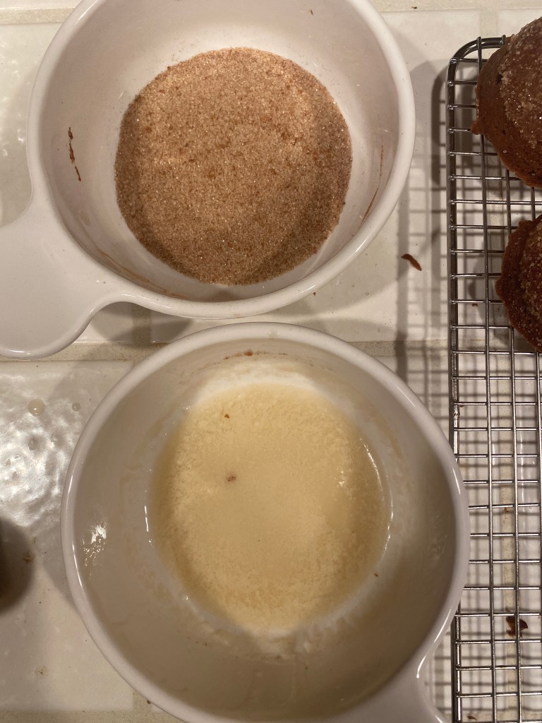 4. Once slightly cooled, remove from pan, dip in melted vegan butter and then into cinnamon sugar mixture. Enjoy!
