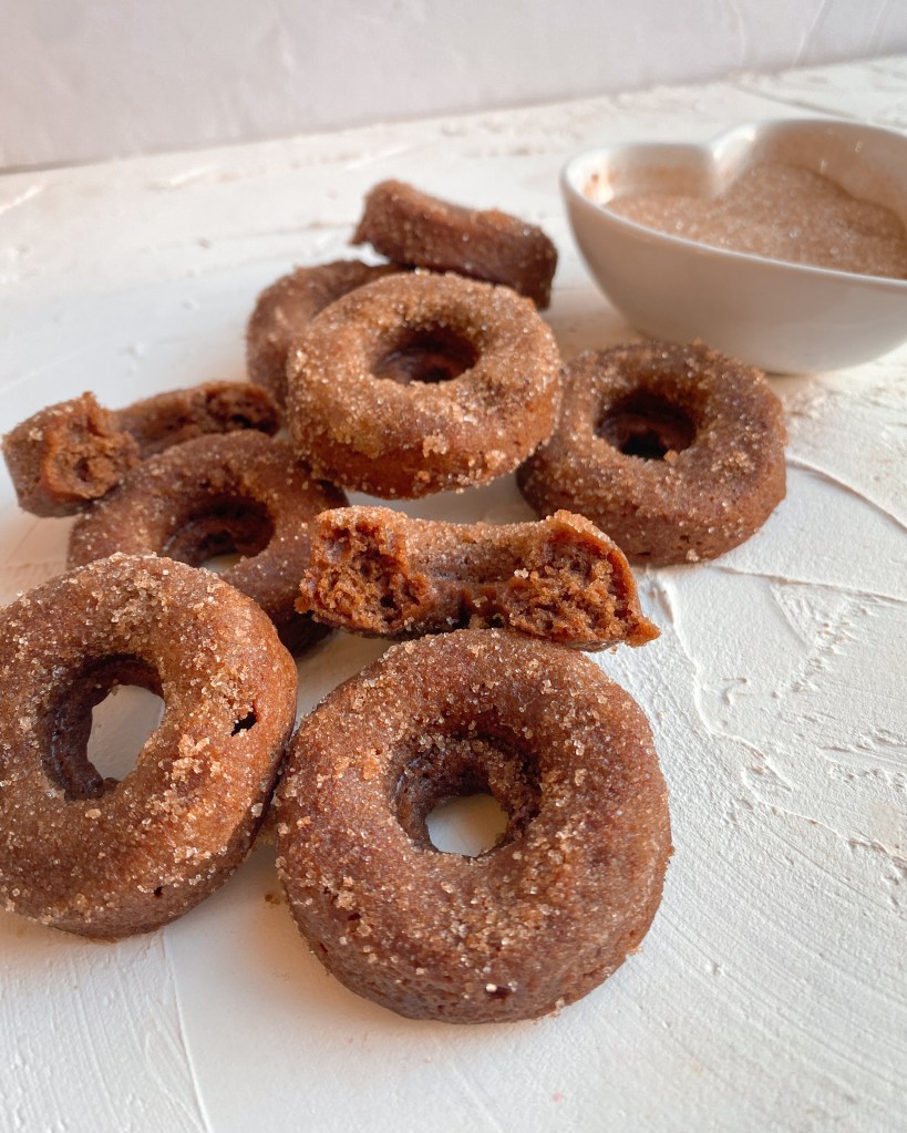 Remove from the donut pan. In a shallow bowl, melt the vegan butter. In another shallow bowl, mix together the cinnamon and sugar. Carefully dip the donuts in the melted vegan butter and then immediately into the cinnamon sugar.