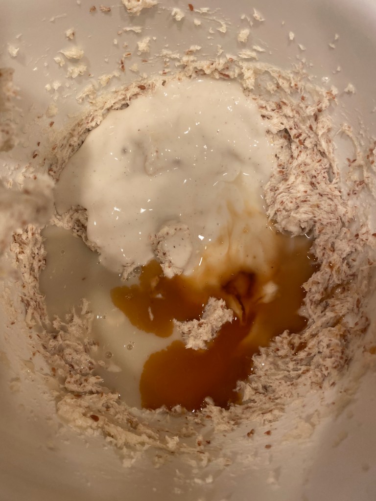 1. Preheat oven to 350F. Beat together vegan butter and sugar, add in flax eggs and combine. Mix in the dairy free yogurt, oat milk, and vanilla extract.