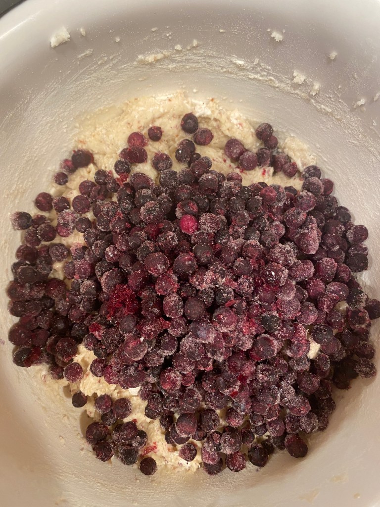 2. Add in the flour, baking powder, and baking soda and fold until mostly combined. Then fold in the wild blueberries.