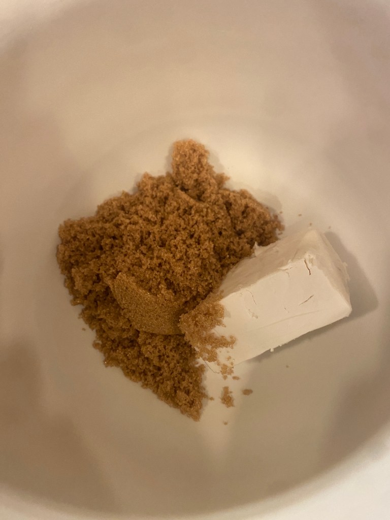 - Preheat oven to 375F and line a muffin tin with paper liners. In a medium bowl, beat together the vegan butter and brown sugar until light and fluffy with an electric hand mixer.
