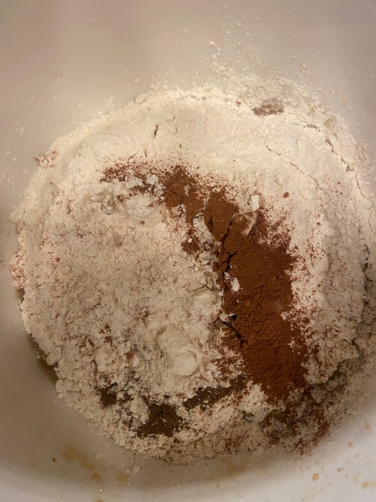 - Then add in the cinnamon, allspice, baking powder, baking soda, and flour. Beat with the hand mixer until just combined, and then fold together the batter to make sure no flour pockets remain.