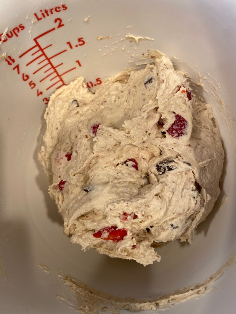 3. Once combined, but not over mixed, adding in the chocolate chips and chopped strawberries. Fold together and then scoop onto the prepared pans.